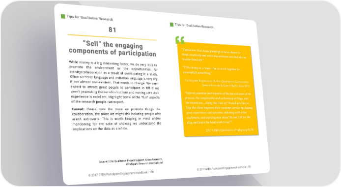 Tips for Qualitative Research Tips for Qualitative Research 81 ƈSellƉ the engaging ȃTurned out that focus groups give me a chance to components of participation think creatively and voice my opinions and feel like an insider (kind of).Ȅ While money is a big motivating factor, we do very little to ȃI like being on a team - fun to work together to promote the environment or the opportunities for accomplish something.Ȅ activity/collaboration as a result of participating in a study. Often screener language and invitation language is very dry, - Participant Experience Online Qualitative Community, if not almost non-existent. That needs to change. We can't Jessica Broome & Kerry Hecht, May 2016 expect to attract great people to participate in MR if we aren't promoting the benefits to them and making sure their ȃInform potential participants of the fun and ease of the experience is excellent. Highlight some of the Ȋfunȋ aspects proc ess, the comfortable and welcoming settings, and of the research people can expect. the incentives…Along the lines of: ȂWould you like to Caveat: Please note the more we promote things like help the client improve their customer service by sharing collaboration, the more we might risk isolating people who your experiences and opinions, debating with other aren’t extroverts. This is worth keeping in mind and/or customers, and creating new ideas? Be our VIP for the mentioning for the sake of showing we understand the day, and leave the hard work to us!ȂȄ implications on the data as a whole. - 2017 GRBN Qualitative Workgroup ROR Source: Echo Qualitative Project Support, KNow Research, MindSpark Research International © 2017 GRBN Participant Engagement Handbook | 190 © 2017 GRBN Participant Engagement Handbook | 191