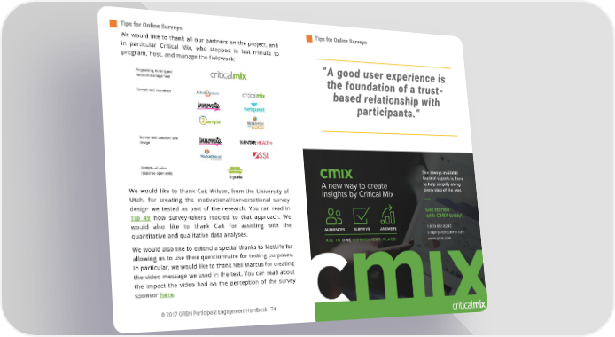 Tips for Online Surveys Tips for Online Surveys We would like to thank all our partners on the project, and in particular Critical Mix, who stepped in last minute to program, host, and manage the fieldwork: ƈA good user experience is the foundation of a trust- based relationship with participants.Ɖ We would like to thank Cait Wilson, from the University of Utah, for creating the motivational/conversational survey design we tested as part of the research. You can read in Tip 49 how survey-takers reacted to that approach. We would also like to thank Cait for assisting with the quantitative and qualitative data analyses. We would also like to extend a special thanks to MetLife for allowing us to use their questionnaire for testing purposes. In particular, we would like to thank Neil Marcus for creating the video message we used in the test. You can read about the impact the video had on the perception of the survey sponsor here. © 2017 GRBN Participant Engagement Handbook | 74 © 2017 GRBN Participant Engagement Handbook | 75