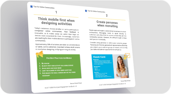 Tips for Online Communities Tips for Online Communities 1 2 Create personas Think mobile first when when recruiting designing activities Today’s customers choose whether or not to participate in People want and expect a personalized experience in online companies’ online communities. Their feedback is communities. Messaging needs to speak directly to invaluable, so it makes sense we solicit their input on customers and allow them to connect emotionally with the devices most convenient for them. Increasingly, customers community sponsor. However, it’s difficult to get to know are reaching for their mobile devices to participate in online each person individually. communities. Consider using personas to define your customer groups. Approximately 50% of activities are taken on a mobile device Personas are fictional, generalized representations that help or tablet, so it is extremely important to keep small screens you relate to your customer groups as humans, and can help in mind when designing and programming an activity. you tailor recruitment approaches to each group. FIVE BEST PRACTICES FOR MOBILE 1. BE CONCISE 2. ALWAYS TEST YOUR ACTIVITY ON A MOBILE DEVICE 3. AVOID GRIDS AND RANK ORDER 4. LIMIT THE NUMBER OF OPEN-ENDED QUESTIONS 5. SIZE IMAGES FOR SMALL SCREEN AND USE ONLY WHEN NECESSARY Source: Vision Critical Source: Vision Critical © 2017 GRBN Participant Engagement Handbook | 42 © 2017 GRBN Participant Engagement Handbook | 43