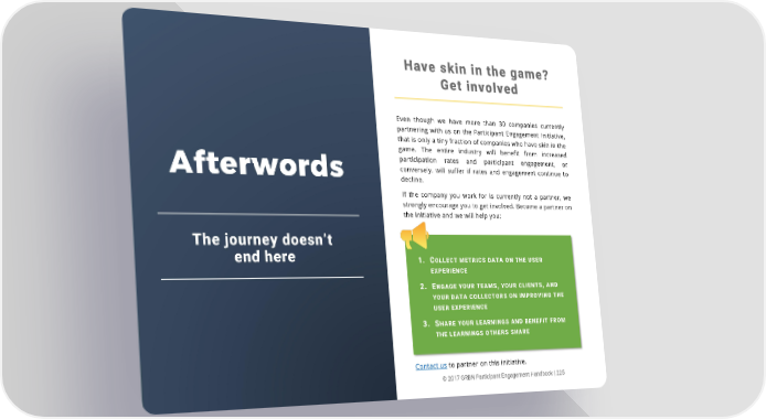 Have skin in the game? Get involved Even though we have more than 30 companies currently partnering with us on the Participant Engagement Initiative, that is only a tiny fraction of companies who have skin in the game. The entire industry will benefit from increased participation rates and participant engagement, or Afterwords conversely, will suffer if rates and engagement continue to decline. If the company you work for is currently not a partner, we strongly encourage you to get involved. Become a partner on the initiative and we will help you: The journey doesn’t end here 1. COLLECT METRICS DATA ON THE USER EXPERIENCE 2. ENGAGE YOUR TEAMS, YOUR CLIENTS, AND YOUR DATA COLLECTORS ON IMPROVING THE USER EXPERIENCE 3. SHARE YOUR LEARNINGS AND BENEFIT FROM THE LEARNINGS OTHERS SHARE Contact us to partner on this initiative. © 2017 GRBN Participant Engagement Handbook | 224 © 2017 GRBN Participant Engagement Handbook | 225