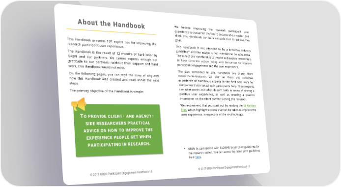 We believe improving the research participant user About the Handbook experience is crucial for the future success of our sector, and think this Handbook can be a valuable tool to achieve this goal. This Handbook presents 101 expert tips for improving the This Handbook is not intended to be a definitive industry research participant user experience. guideline* and the advice is not intended to be exhaustive. The Handbook is the result of 12 months of hard labor by The aim of the Handbook is to inspire and enable researchers GRBN and our partners. We cannot express enough our to take concrete action today and tomorrow to improve gratitude to our partners—without their support and hard participant engagement and the user experience. work, this Handbook would not exist. The tips contained in this Handbook are drawn from On the following pages, you can read the story of why and research-on-research, as well as from the collective how this Handbook was created and read about the next experience of numerous experts in the field who work for steps. companies that interact with participants daily. These experts The primary objective of the Handbook is simple: see what works and what doesn’t both in terms of driving a positive user experience, as well as creating a positive impression on the client commissioning the research. We recommend that you start out by reading the 10 Golden Tips, which highlight actions that can be taken to improve the TO PROVIDE CLIENT- AND AGENCY- user experience, irrespective of the methodology. SIDE RESEARCHERS PRACTICAL ADVICE ON HOW TO IMPROVE THE EXPERIENCE PEOPLE GET WHEN PARTICIPATING IN RESEARCH. * GRBN in partnership with ESOMAR issues joint guidelines for the research sector. You can access the latest joint guidelines from here. © 2017 GRBN Participant Engagement Handbook | 8 © 2017 GRBN Participant Engagement Handbook | 9