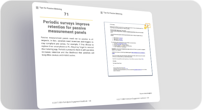 Tips for Passive Metering Tips for Passive Metering 71 Periodic surveys improve retention for passive measurement panels Passive measurement panels need not be passive in all respects. In fact, panelists need incentives and triggers to stay compliant and active. For example, if they choose to replace their smartphone or PC, they may forget to reinstall the metering app. Periodic surveys to check in with panelists increases retention and the likelihood that panelists will keep their devices and meters active. Source: Verto Analytics © 2017 GRBN Participant Engagement Handbook | 168 © 2017 GRBN Participant Engagement Handbook | 169