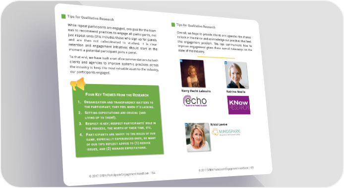 Tips for Qualitative Research Tips for Qualitative Research While repeat participants are engaged, one goal for the team Overall, we hope to provide clients and agencies the chance was to recommend practices to engage all participants, not to look in the mirror and acknowledge our practices that feed just repeat ones (this includes those who sign up for panels this engagement problem. The tips communicate how to and are then not called/invited to studies). It is clear improve engagement given these overall takeaways on the retention and engagement initiatives should start at the state of the industry. moment a potential participant joins a panel. To that end, we have built a set of recommendations to both clients and agencies to improve systemic practices across the industry to keep the most valuable asset to the industry, our participants engaged. Kerry Hecht Labsuirs Katrina Noelle FOUR KEY THEMES FROM THE RESEARCH 1. ORGANIZATION AND TRANSPARENCY MATTERS TO THE PARTICIPANT; THEY FEEL WHEN IT’S LACKING. 2. SETTING EXPECTATIONS ARE CRUCIAL (AND LIVING UP TO THEM!). 3. RESPECT IS KEY; RESPECT PARTICIPANTS’ ROLE IN Nikki Lavoie THE PROCESS, THE WORTH OF THEIR TIME, ETC. 4. PARTICIPANTS ARE SAVVY TO THE RULES OF OUR GAME, ESPECIALLY EXPERIENCED ONES, SO MANY OF OUR TIPS REFLECT ADVICE TO (1) REDUCE ISSUES, AND (2) MANAGE EXPECTATIONS. © 2017 GRBN Participant Engagement Handbook | 184 © 2017 GRBN Participant Engagement Handbook | 185
