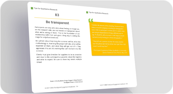 Tips for Qualitative Research Tips for Qualitative Research 83 Be transparent ȃI dislike the process of the screening. You never know what a research company is looking for demographic- Participants are very articulate about feeling as though we, wise. I like to participate in them and it is unfair when on the research side, are not honest or transparent about you can get disqualified for being a different race or what we're asking of them. This is the foundation of our age. It should be able to accept a wide range of people relationship with them and goes a long way to setting the instead of only looking for certain demographics.Ȅ stage for a dysfunctional one. Be upfront about how long the screener will be, what the ȃThey left out a portion of what the study entailed methodology is, how long the project will take, what will be over the phone and told me about once I got there. Left, expected of them, and what they will get out of it. They wasn't worth my time.Ȅ appreciate this and it's nothing that can't be built into the - Participant Experience Online Qualitative Community, screener. Jessic a Broome & Kerry Hecht, May 2016 Clients must give direction for suppliers to be as proactive and clear to the participant as possible about the logistics and what to expect. Be sure to share key details multiple times! Source: Echo Qualitative Project Support, KNow Research, MindSpark Research International © 2017 GRBN Participant Engagement Handbook | 194 © 2017 GRBN Participant Engagement Handbook | 195