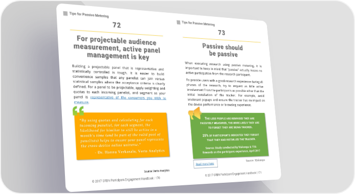 Tips for Passive Metering Tips for Passive Metering 72 73 For projectable audience Passive should measurement, active panel be passive management is key When executing research using passive metering, it is Building a projectable panel that is representative and important to keep in mind that Ȋpassiveȋ actually means no statistically controlled is tough. It is easier to build active participation from the research participant. convenience samples that any panelist can join versus To provide users with a good research experience during all statistical samples where the acceptance criteria is clearly phases of the research, try to request as little active defined. For a panel to be projectable, apply weighting and involvement from the participants as possible other than the quotas to each incoming panelist, and segment so your initial installation of the tracker. For example, avoid panel is representative of the consumers you wish to irrelevant popups and ensure the tracker has no impact on measure. the device performance or browsing experience. ȃBy using quotas and calculating for each THE LESS PEOPLE ARE REMINDED THEY ARE incoming panelist, for each segment, the PASSIVELY MEASURED, THE MORE LIKELY THEY ARE likelihood for him/her to still be active in a TO FORGET THEY ARE BEING TRACKED. monthȂs time (and be part of the valid pool of 25% OF PARTICIPANTS INDICATED THEY FORGOT panelists) helps to ensure your panel represents THAT THEY HAD INSTALLED THE TRACKER. the cross-device online universe.Ȅ - Dr. Hannu Verkasalo, Verto Analytics Source: Study conducted by Wakoopa & TEG: Rewards on the participant experience, April 2017 Read more here Source: Wakoopa Source: Verto Analytics © 2017 GRBN Participant Engagement Handbook | 170 © 2017 GRBN Participant Engagement Handbook | 171