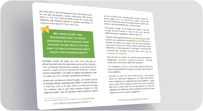 Secondly, what if we are transparent about who the survey is can be convinced that creating great surveys is good for for and give participants a great experience? Will survey- brand equity, then the demand for Ȋbadȋ surveys will takers, in that case, think positively about the brand and, decrease, enabling the industry to deliver better insights back therefore, will research become a positive contributor to to their clients more efficiently…a virtuous circle. 2 long-term brand equity ? If that is the case: Fortunately, enough of the leaders we talked to had the courage and the foresight to buy into this vision and the GRBN Participant Engagement Initiative was born. WHY WOULD CLIENT-SIDE They also had the generosity to sponsor the initiative, which RESEARCHERS WANT TO CREATE enabled us to spend the time necessary to drive the project EXPERIENCES WHICH DAMAGED THEIR forward. Since that day in Utah, more and more companies CATEGORY OR WHY WOULD THEY NOT have come on-board the initiative, either contributing money, WANT TO CREATE EXPERIENCES WHICH their time, or other resources to the project. By the time the Handbook was launched, one year later, more than 30 CREATE POSITIVE BRAND EQUITY? companies are involved. Over the last 12 months, the partners have participated in Marketers across the globe are very much focused on workgroups, conducted research-on-research, collected delivering great customer experiences across all touchpoints. metrics data, and contributed to the Handbook. This Handbook is the fruit of all those efforts and we are From a customer’s perspective, a survey, or any other type of research, is just another touchpoint with the brand. From the extremely grateful for the support and active contributions of brand’s perspective, it is either an opportunity gained or lost all our partners. to create value for customers and build brand equity. Two years on from the start of the journey, I led a panel Armed with our data and these thoughts, we invited a group session on Participant Engagement at Insight Association’s of industry leaders attending the CASRO Annual Conference Next Conference to a standing-room only audience. I could in Park City, Utah, in October 2016, to a breakfast meeting. sense a clear shift in attitudes towards the issue and believe The intention was to get these industry leaders to take the sector is now ready to seize the moment and take the collective action. They immediately understood that if clients collective and individual actions needed to improve the user experience and participant engagement. 2 Our latest research shows that this is indeed the case. See Tip 62 for details. © 2017 GRBN Participant Engagement Handbook | 16 © 2017 GRBN Participant Engagement Handbook | 17