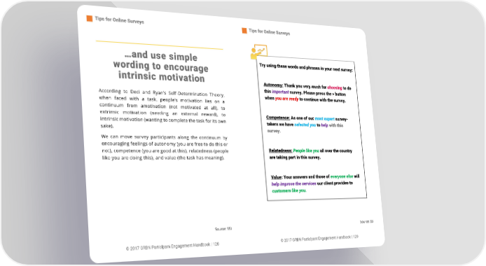 Tips for Online Surveys Tips for Online Surveys 56 …and use simple Try using these words and phrases in your next survey: wording to encourage intrinsic motivation Autonomy: Thank you very much for choosing to do this important survey. Please press the > button According to Deci and Ryan’s Self-Determination Theory, when you are ready to continue with the survey. when faced with a task, people’s motivation lies on a continuum from amotivation (not motivated at all), to extrinsic motivation (needing an external reward), to Competence: As one of our most expert survey- intrinsic motivation (wanting to complete the task for its own takers we have selected you to help with this sake). survey. We can move survey participants along the continuum by encouraging feelings of autonomy (you are free to do this or not), competence (you are good at this), relatedness (people Relatedness: People like you all over the country like you are doing this), and value (the task has meaning). are taking part in this survey. Value: Your answers and those of everyone else will help improve the services our client provides to customers like you. Source: SSI Source: SSI © 2017 GRBN Participant Engagement Handbook | 128 © 2017 GRBN Participant Engagement Handbook | 129