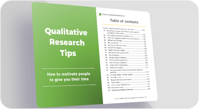 Tips for Qualitative Research Tips for Qualitative Research Table of contents How to motivate people to give you their time ..................... 182 79. Be advisors to your clients/look at your suppliers as experts in their roles ................................................. 186 Qualitative 80. Use targeted blasts/pre-qualifications .......................... 188 81. ȊSellȋ the engaging components of participation .......... 190 82. Refresh terminology ....................................................... 192 83. Be transparent ............................................................... 194 Research 84. Be clear on what to expect ............................................ 196 85. Explain the impact .......................................................... 198 86. Reduce screener length ................................................. 200 87. Be flexible when you rescreen ....................................... 202 88. End the games ................................................................ 204 Tips 89. Update contact methods ................................................ 206 90. Continue the transparency ............................................ 207 91. Use a friendly moderator ............................................... 208 92. Allow time for icebreakers ............................................. 210 93. Enforce the impact ......................................................... 212 94. Use group tasks/collaborative activities whenever How to motivate people possible .......................................................................... 214 95. Consider fewer Ȋblindedȋ studies .................................. 216 to give you their time 96. Consider in-situ .............................................................. 217 97. Respect the time commitment ....................................... 218 98. Thank them ..................................................................... 219 99. Continue the feedback loop ........................................... 220 100. Share the impact ............................................................ 221 101. Surprise and delight with bonuses ............................................. 223 © 2017 GRBN Participant Engagement Handbook | 181 © 2017 GRBN Participant Engagement Handbook | 181