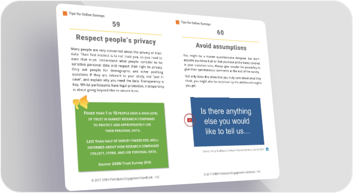 Tips for Online Surveys Tips for Online Surveys 59 60 Respect people’s privacy Avoid assumptions Many people are very concerned about the privacy of their You might be a master questionnaire designer, but don’t data. Their first instinct is to not trust you, so you need to assume you know it all or that you have all the bases covered earn that trust. Understand what people consider to be in your questionnaire. Always give people the possibility to sensitive personal data and respect their right to privacy. give their spontaneous comments at the end of the survey. Only ask people for demographic and other profiling Not only does this show that you truly care about what they questions if they are relevant to your study, not Ȋjust in caseȋ, and explain why you need the data. Transparency is think, you might also be surprised by the additional insights key. Whilst participants have legal protection, transparency you get. is about going beyond this to secure trust. FEWER THAN 1 IN 10 PEOPLE HAVE A HIGH LEVEL OF TRUST IN MARKET RESEARCH COMPANIES TO PROTECT AND APPROPRIATELY USE THEIR PERSONAL DATA. LESS THAN HALF OF SURVEY-TAKERS FEEL WELL- INFORMED ABOUT HOW RESEARCH COMPANIES COLLECT, STORE, AND USE PERSONAL DATA. Source: Kelsy Saulsbury, Schwan's Shared Services, IIeX NA 2017 Source: GRBN Trust Survey 2016 © 2017 GRBN Participant Engagement Handbook | 142 © 2017 GRBN Participant Engagement Handbook | 143