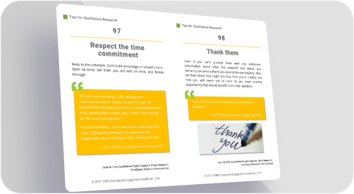 Tips for Qualitative Research Tips for Qualitative Research 97 98 Respect the time Thank them commitment Even if you can't provide them with any additional information about what the research was about, you Keep to the schedule. Don’t take advantage of people’s time. certainly can send a thank you note to the participants. Also, Start on time, tell them you will end on time, and follow let them know they might not hear from you in a while, but through. that you will reach out as soon as you have another opportunity that would benefit from their opinions. ȃIt takes some planning…like, getting your ȃYou sort of want to feel valued, like your opinion confirmation sooner. I mean, in some IȂve got the confirmation that day, you know. I was going back and is valued.Ȅ forth, sending them emails, and, I mean, whatȂs going - 2017 GRBN Qualitative Workgroup ROR on? So, I can plan my day.Ȅ ȃGood hospitality – water and snacks and things like that. Caffeinated beverages. We appreciate the comfortable chair. Starting on time. Leaving on time.Ȅ - 2017 GRBN Qualitative Workgroup ROR Source: Echo Qualitative Project Support, KNow Research, Source: Echo Qualitative Project Support, KNow Research, MindSpark Research International MindSpark Research International © 2017 GRBN Participant Engagement Handbook | 218 © 2017 GRBN Participant Engagement Handbook | 219
