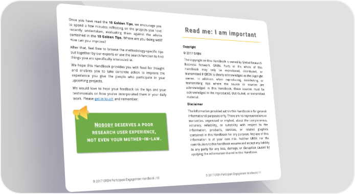 Once you have read the 10 Golden Tips, we encourage you to spend a few minutes reflecting on the projects you have Read me: I am important recently undertaken, evaluating them against the advice contained in the 10 Golden Tips. Where are you doing well? How can you improve? Copyright After that, feel free to browse the methodology-specific tips © 2017 GRBN put together by our experts or use the search function to find The copyright on this Handbook is owned by Global Research things you are specifically interested in. Business Network, GRBN. Parts or the whole of this We hope this Handbook provides you with food for thought Handbook may only be reproduced, distributed, or and enables you to take concrete action to improve the transmitted if GRBN is clearly acknowledged as the copyright experience you give the people who participate in your owner. In addition, when reproducing, distributing, or upcoming projects. transmitting tips where the source or sources are We would love to hear your feedback on the tips and your acknowledged in this Handbook, those sources must be testimonials on how you’ve incorporated them in your daily acknowledged in the reproduced, distributed, or transmitted work. Please get in touch and remember: material. Disclaimer The information provided within this Handbook is for general informational purposes only. There are no representations or NOBODY DESERVES A POOR warranties, expressed or implied, about the completeness, accuracy, reliability, or suitability with respect to the RESEARCH USER EXPERIENCE, information, products, services, or related graphics NOT EVEN YOUR MOTHER-IN-LAW. contained in this Handbook for any purpose. Any use of this information is at your own risk. Neither GRBN nor the contributors to this handbook assume and accept any liability to any party for any loss, damage, or disruption caused by applying the information shared in this Handbook. © 2017 GRBN Participant Engagement Handbook | 10 © 2017 GRBN Participant Engagement Handbook | 11