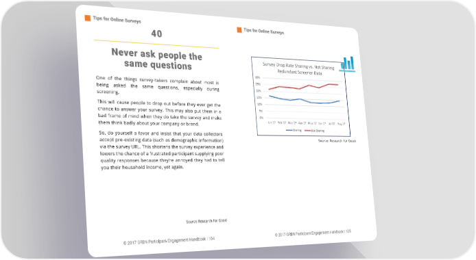 Tips for Online Surveys Tips for Online Surveys 40 Never ask people the Survey Drop Rate Sharing vs. Not Sharing same questions Redundant Screener Data 30% One of the things survey-takers complain about most is 25% being asked the same questions, especially during 20% screening. 15% This will cause people to drop out before they ever get the 10% chance to answer your survey. This may also put them in a 5% bad frame of mind when they do take the survey and make 0% them think badly about your company or brand. Jan-17 Feb-17 Mar-17 Apr-17 May-17 Jun-17 Jul-17 Aug-17 Sharing Not Sharing So, do yourself a favor and insist that your data collectors accept pre-existing data (such as demographic information) Source: Research For Good via the survey URL. This shortens the survey experience and lowers the chance of a frustrated participant supplying poor quality responses because they’re annoyed they had to tell you their household income, yet again. Source: Research For Good © 2017 GRBN Participant Engagement Handbook | 104 © 2017 GRBN Participant Engagement Handbook | 105