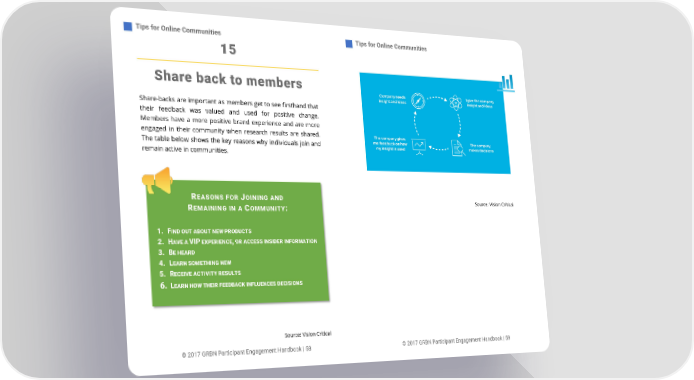 Tips for Online Communities Tips for Online Communities 15 Share back to members Share-backs are important as members get to see firsthand that their feedback was valued and used for positive change. Members have a more positive brand experience and are more engaged in their community when research results are shared. The table below shows the key reasons why individuals join and remain active in communities. REASONS FOR JOINING AND Source: Vision Critical REMAINING IN A COMMUNITY: 1. FIND OUT ABOUT NEW PRODUCTS 2. HAVE A VIP EXPERIENCE, OR ACCESS INSIDER INFORMATION 3. BE HEARD 4. LEARN SOMETHING NEW 5. RECEIVE ACTIVITY RESULTS 6. LEARN HOW THEIR FEEDBACK INFLUENCES DECISIONS Source: Vision Critical © 2017 GRBN Participant Engagement Handbook | 58 © 2017 GRBN Participant Engagement Handbook | 59