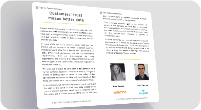 Tips for Passive Metering Tips for Passive Metering Customers’ trust gain. People we serve as customers need to be informed, means better data empowered, and capable of making choices. These principles especially apply to the collection of behavioral data. Certainly, behavioral data is a wonderful and amazing addition to our lives. Nevertheless, it is obvious Citizens are the best source of rich and meaningful data. But that when people generate thousands of data points every questionable data practices and zero-sum business models day they become more vulnerable to exposure in have been eroding consumers' trust. To protect themselves unimaginable ways. from such practices, citizens are likely to not provide data or We firmly believe that our responsibility as market research provide fake data. professionals is to always act according to the highest In much of the world, it’s become a widely held view that ethical standards. For decades, this has been the promise of models rely on Ȋpeople as an assetȋ—it cannot continue. our industry to society and it must be maintained in the future. In doing this, we will be building a more valuable, Regulation won’t allow for it. People won’t stand for it. In trustable, and sustainable data industry. 2017, privacy and transparency are not only compliance requirements, they are pre-requisites for every organization, and in 2018, these requirements will become even tougher as the General Data Protection Regulation is introduced in the EU. We urge our industry to turn from a data-centered to a human-centered approach. If we think about it, it is just a matter of getting back to basics. A more balanced data environment with more visibility and openness about data flows can contribute to the increase of participants' trust. In this chapter, we will describe a set of practices that put the user in the center of their own data instead of the Anna Hebbeln Oriol Llauradó current internet business model, where companies are in full control and make the most out of the data for their own © 2017 GRBN Participant Engagement Handbook | 160 © 2017 GRBN Participant Engagement Handbook | 161