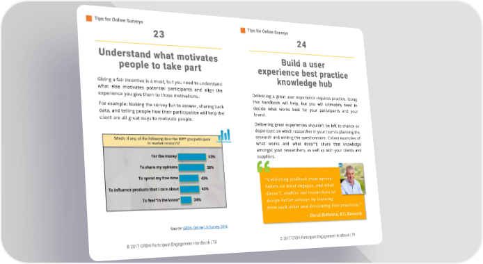Tips for Online Surveys Tips for Online Surveys 23 24 Understand what motivates Build a user people to take part experience best practice Giving a fair incentive is a must, but you need to understand knowledge hub what else motivates potential participants and align the Delivering a great user experience requires practice. Using experience you give them to those motivations. this handbook will help, but you will ultimately need to For example: Making the survey fun to answer, sharing back decide what works best for your participants and your data, and telling people how their participation will help the brand. client are all great ways to motivate people. Delivering great experiences shouldn’t be left to chance or dependent on which researcher in your team is planning the research and writing the questionnaire. Collect examples of what works and what doesn’t; share that knowledge amongst your researchers, as well as with your clients and suppliers. ȃCollecting feedback from survey- takers on what engages, and what doesnȂt, enables our researchers to design better surveys by learning from each other and developing best practices.Ȅ - David Rothstein, RTi Research Source: GRBN Online UX Survey 2016 © 2017 GRBN Participant Engagement Handbook | 78 © 2017 GRBN Participant Engagement Handbook | 79
