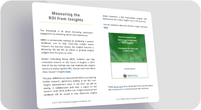 Measuring the teams implement a ROI measurement program and ROI from Insights demonstrate the impact insights have on the business. You can read more about the ROI from Insights Initiative here. This Handbook is all about increasing participant engagement by delivering better user experiences. GRBN is concurrently working on producing a second handbook; one to help client-side insights teams measure the business impact the insights function is delivering. We see ROI as critical to growing insights budgets over the years to come. Boston Consulting Group (BCG), Cambiar, and Yale conducted research on the Future of Insights in 2015. One of the key findings was that relatively few insights teams are measuring their ROI. You can read more about these research insights here. This year, GRBN has co-operated with BCG on conducting further research, specifically looking at the ROI from insights measurement issue. In Q4 2017, we will be issuing, in collaboration with BCG, a report on the Please get in touch if you would like to find out more about research. In Q1 2018, an ROI from insights measurement this initiative and to receive the report and Handbook. handbook will be issued to help client-side insights © 2017 GRBN Participant Engagement Handbook | 228 © 2017 GRBN Participant Engagement Handbook | 229