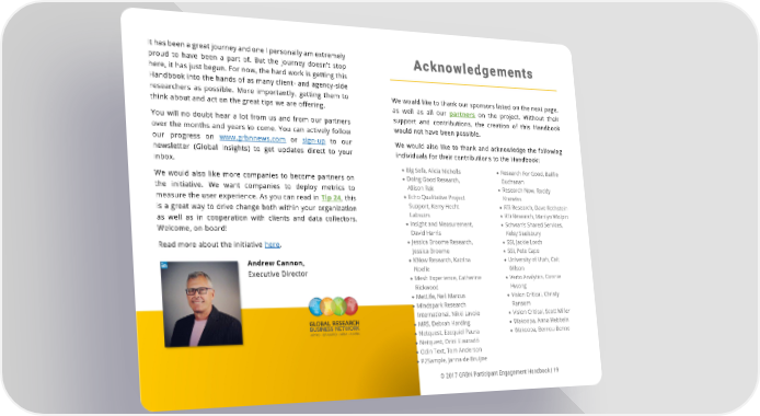 It has been a great journey and one I personally am extremely Acknowledgements proud to have been a part of. But the journey doesn’t stop here, it has just begun. For now, the hard work is getting this Handbook into the hands of as many client- and agency-side researchers as possible. More importantly, getting them to We would like to thank our sponsors listed on the next page, think about and act on the great tips we are offering. as well as all our partners on the project. Without their You will no doubt hear a lot from us and from our partners support and contributions, the creation of this Handbook over the months and years to come. You can actively follow would not have been possible. our progress on www.grbnnews.com or sign-up to our We would also like to thank and acknowledge the following newsletter (Global Insights) to get updates direct to your individuals for their contributions to the Handbook: inbox. Big Sofa, Alicia Nicholls Research For Good, Baillie We would also like more companies to become partners on Doing Good Research, Buchanan the initiative. We want companies to deploy metrics to Allison Rak Research Now, Roddy measure the user experience. As you can read in Tip 24, this Echo Qualitative Project Knowles is a great way to drive change both within your organization Support, Kerry Hecht RTi Research, Dave Rothstein as well as in cooperation with clients and data collectors. Labsuirs RTi Research, Marilyn Wolpin Welcome, on-board! Insight and Measurement, Schwan's Shared Services, David Harris Kelsy Saulsbury Read more about the initiative here. Jessica Broome Research, SSI, Jackie Lorch Jessica Broome SSI, Pete Cape Andrew Cannon, KNow Research, Katrina University of Utah, Cait Executive Director Noelle Wilson Mesh Experience, Catherine Verto Analytics, Connie Rickwood Hwong MetLife, Neil Marcus Vision Critical, Christy Mindspark Research Ransom International, Nikki Lavoie Vision Critical, Scott Miller MRS, Debrah Harding Wakoopa, Anna Hebbeln Netquest, Ezequiel Paura Wakoopa, Bernou Benne Netquest, Oriol Llauradó Odin Text, Tom Anderson P2Sample, Janna de Bruijne © 2017 GRBN Participant Engagement Handbook | 18 © 2017 GRBN Participant Engagement Handbook | 19