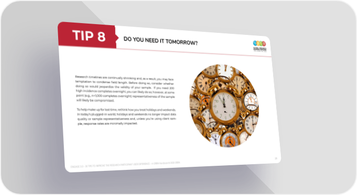 TIp 8 do You need It toMoRRoW? Research timelines are continually shrinking and, as a result, you may face temptation to condense field length. Before doing so, consider whether doing so would jeopardize the validity of your sample. If you need 200 high incidence completes overnight, you can likely do so; however, at some point (e.g., n=1,000 completes overnight) representativeness of the sample will likely be compromised. To help make up for lost time, rethink how you treat holidays and weekends. In today’s plugged-in world, holidays and weekends no longer impact data quality or sample representativeness and, unless you’re using client sam- ple, response rates are minimally impacted. ENGAGE 2.0 - 30 TIPS TO IMPROVE THE RESEARCH PARTICIPANT USER EXPERIENCE – A GRBN Handbook © 2020 GRBN 29