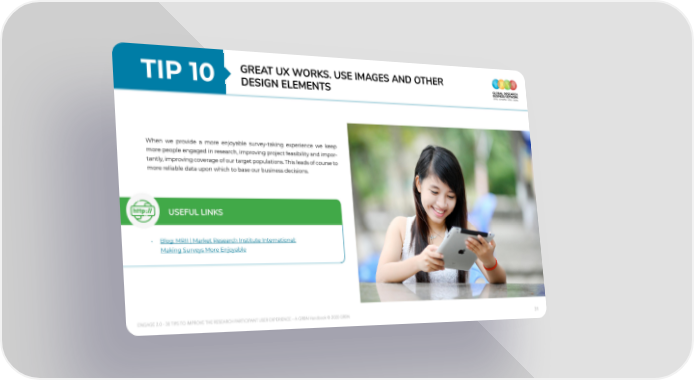 TIp 10 GReAt uX WoRkS. uSe IMAGeS And otheR deSIGn eLeMentS When we provide a more enjoyable survey-taking experience we keep more people engaged in research, improving project feasibility and impor- tantly, improving coverage of our target populations. This leads of course to more reliable data upon which to base our business decisions. uSeFuL LInkS • Blog: MRII | Market Research Institute International: Making Surveys More Enjoyable ENGAGE 2.0 - 30 TIPS TO IMPROVE THE RESEARCH PARTICIPANT USER EXPERIENCE – A GRBN Handbook © 2020 GRBN 31