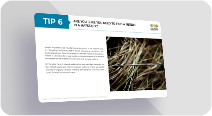 TIp 6 ARe You SuRe You need to FInd A needLe In A hAYStACk? Sample acquisition is as important as other aspects of the research proj- ect. Targeting is frequently used to reduce interviewing costs, but it’s not always appropriate. If one of the stated, or unstated, objectives is to size the market or understand gen pop incidence, targeting needs to be avoided and sample should be balanced to the (relevant) gen pop audience. On the other hand, if a target audience has been identified, targeting can be a helpful way to save interviewing costs and time. Online panels offer a variety of targeting variables, including demographics, consumption be- havior, financial behavior and more! ENGAGE 2.0 - 30 TIPS TO IMPROVE THE RESEARCH PARTICIPANT USER EXPERIENCE – A GRBN Handbook © 2020 GRBN 27