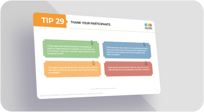 TIp 29 thAnk YouR PARtICIPAntS “I truly appreciate being thanked for participating. “I like that there was a video of an actual person telling That is a huge incentive to complete more for Met Life the survey-takers that the surveys have actually been in the future. I now have a greater appreciation for this useful to a real company and my participation may company as well.” help a company.” “I thought it was just like all other surveys until I watched “I also like the personal touch with the video at the end. the video and found out exactly what they are trying to I like knowing how my participation may help a company.” accomplish.” Source: GRBN Online Survey Experience A/B Testing ENGAGE 2.0 - 30 TIPS TO IMPROVE THE RESEARCH PARTICIPANT USER EXPERIENCE – A GRBN Handbook © 2020 GRBN 51