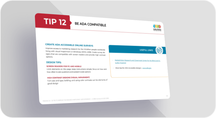 TIp 12 be AdA CoMPAtIbLe creaTe ada accessIble onlIne surveys Improve access to marketing research for the 1.8 billion people worldwide uSeFuL LInkS living with visual impairment or blindness (WHO, 2018). Create survey de- signs that are compatible with screen readers and provide high contrast options. • MarketVision Research and Clovernook Center for the Blind and Vi- desIgn TIps: sually Impaired screen readers for pc and mobIle • More tips for ADA Accessible designs - www.ada.gov Limit elements on the page, keep instructions simple, focus on how and how often to ask questions and present scale options HIgH contrast desIgns (vIsual ImpaIrment) Font size and type, bolding, and using color contrasts can be elements of good design ENGAGE 2.0 - 30 TIPS TO IMPROVE THE RESEARCH PARTICIPANT USER EXPERIENCE – A GRBN Handbook © 2020 GRBN 33