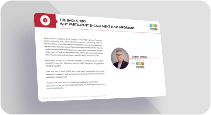 the bACk StoRY WhY PARtICIPAnt enGAGe Ment IS So IMPoRtAnt Armed with our data and these thoughts, we invited a group of industry leaders attending the CASRO Annual Conference in Park City, Utah, in October 2016, to a breakfast meeting. The intention was to get these industry leaders to take collective action. They immediately understood that if clients can be convinced that creating great surveys is good for brand equity, then the demand for “bad” surveys will decrease, enabling the industry to deliver better insights back to their clients more efficiently…a virtuous circle. AndReW CAnnon, Fortunately, enough of the leaders we talked to had the courage and the Executive Director foresight to buy into this vision and the GRBN Participant Engagement Initiative was born. Over the last 3 years, GRBN has undertaken workgroups, conducted research-on-research, and worked with individual companies to improve participant engagement. You can read more about the work we are doing here, and please get in touch if you are interested in us helping you deliver great experiences to your participants. ENGAGE 2.0 - 30 TIPS TO IMPROVE THE RESEARCH PARTICIPANT USER EXPERIENCE – A GRBN Handbook © 2020 GRBN 16