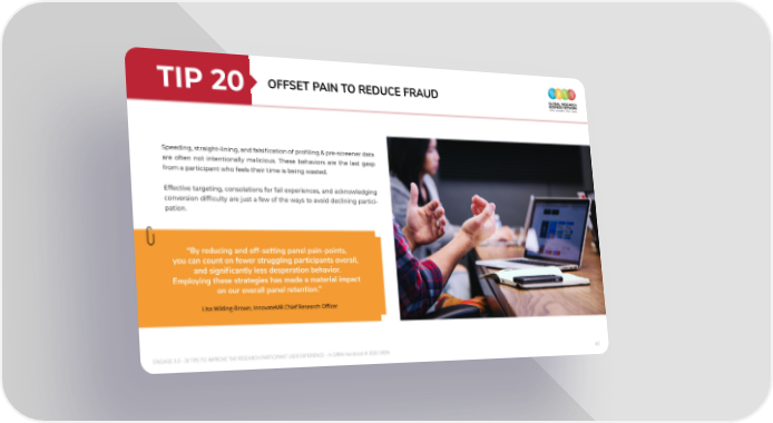 TIp 20 oFFSet PAIn to ReduCe FRAud Speeding, straight-lining, and falsification of profiling & pre-screener data are often not intentionally malicious. These behaviors are the last gasp from a participant who feels their time is being wasted. Effective targeting, consolations for fail experiences, and acknowledging conversion difficulty are just a few of the ways to avoid declining partici- pation. “by reducing and off-setting panel pain-points, you can count on fewer struggling participants overall, and significantly less desperation behavior. employing these strategies has made a material impact on our overall panel retention.” Lisa Wilding-Brown, InnovateMR Chief Research Officer ENGAGE 2.0 - 30 TIPS TO IMPROVE THE RESEARCH PARTICIPANT USER EXPERIENCE – A GRBN Handbook © 2020 GRBN 41