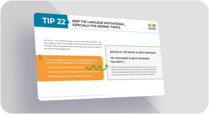 TIp 22 keeP the LAnGuAGe MotIVAtIonAL, eSPeCIALLY FoR ‘boRInG’ toPICS Let’s face it – some research topics are more interesting than others. We can’t magically make a “boring” topic more interesting, but as you may recall from past GRBN handbooks, we can show respondents that we empathize with them to help engage them. InSteAd oF: thIS SuRVeY IS About InSuRAnCe. tRY: thIS SuRVeY IS About InSuRAnCe! the more boring the topic, the more engaging the survey Fun, RIGht? :) needs to be. help engage and focus respondents by: • using concise, conversational language We know, insurance isn’t the most exciting topic but you have an im- • Including motivational language throughout the survey portant role here. With your help, we will have survey results that will allow the survey sponsor to improve their services and launch some • thanking respondents at the end of the survey product. So, grab a cup of coffee and make yourself comfortable.” ENGAGE 2.0 - 30 TIPS TO IMPROVE THE RESEARCH PARTICIPANT USER EXPERIENCE – A GRBN Handbook © 2020 GRBN 43