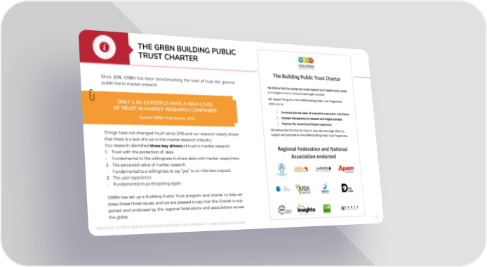 the GRbn buILdInG PubLIC tRuSt ChARteR TheBuilding+Public+Trust Charter+ Since 2016, GRBN has been benchmarking the level of trust the general public has in market research. We#believe#that#the#market#and#social#research#and#insights#sector#needs# to#strengthen#trust#in#research#and#insight#activities. We#support#the#goals#of#the#GRBN#Building#Public#Trust#Programme,# onLY 1-In-10 PeoPLe hAVe A hIGh LeVeL which#are#to: oF tRuSt In MARket ReSeARCh CoMPAnIeS. 1. Communicate+the+value+of+research+to+consumers+and+citizens Source: GRbn trust Survey 2016 2. Increase+transparency+in+research+and+insight+activities 3. Improve+the+research+participant+experience We#believe#that#the#time#for#action#is#now#and#encourage#others#to# Things have not changed much since 2016 and our research clearly shows support#and#participate#in#the#GRBN#Building#Public#Trust#Programme. that there is a lack of trust in the market research industry. Our research identified three key drivers of trust in market research: Regional Federation+and+National+ 1. Trust with the protection of data Association+endorsed • Fundamental to the willingness to share data with market researchers 2. The perceived value of market research • Fundamental to a willingness to say “yes” to an interview request 3. The user experience • Fundamental to participating again GRBN has set up a Building Public Trust program and charter to help ad- dress these three issues, and we are pleased to say that the Charter is sup- ported and endorsed by the regional federations and associations across the globe. ENGAGE 2.0 - 30 TIPS TO IMPROVE THE RESEARCH PARTICIPANT USER EXPERIENCE – A GRBN Handbook © 2020 GRBN 12