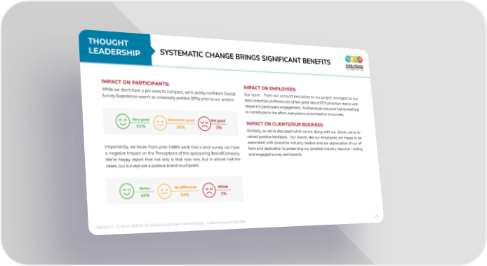 ThoughT SYSteMAtIC ChAnGe bRInGS SIGnIFICAnt beneFItS leadershIp ImpacT on parTIcIpanTs: ImpacT on employees: While we don’t have a pre wave to compare, we’re pretty confident Overall Our team – from our account executives to our project managers to our Survey Experience wasn’t as universally positive (97%) prior to our actions. data collection professionals all feel great about RTi’s proactive stance with respect to participant engagement. And because everyone had something to contribute to the effort, everyone is committed to its success. very good somewhat good not good Impact on clIents/our BusIness: 61% 36% 3% Similarly, as we’ve discussed what we are doing with our clients, we’ve re- ceived positive feedback. Our clients, like our employees, are happy to be associated with proactive industry leaders and are appreciative of our ef- Importantly, we know from prior GRBN work that a poor survey can have forts and dedication to preserving our greatest industry resource – willing a negative Impact on the Perceptions of the sponsoring Brand/Company. and engaged survey participants. We’re happy report that not only is that now rare, but in almost half the cases, our surveys are a positive brand touchpoint. better no difference Worse 44% 54% 2% ENGAGE 2.0 - 30 TIPS TO IMPROVE THE RESEARCH PARTICIPANT USER EXPERIENCE – A GRBN Handbook © 2020 GRBN 20