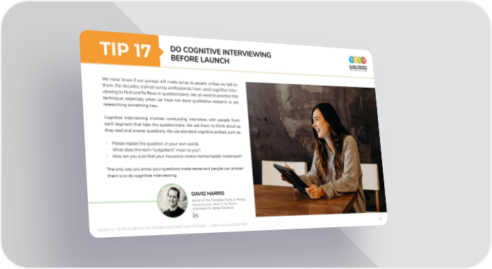 TIp 17 do CoGnItIVe InteRVIeWInG beFoRe LAunCh We never know if our surveys will make sense to people unless we talk to them. For decades, trained survey professionals have used cognitive inter- viewing to find and fix flaws in questionnaires. We all need to practice this technique, especially when we have not done qualitative research or are researching something new. Cognitive interviewing involves conducting interviews with people from each segment that take the questionnaire. We ask them to think aloud as they read and answer questions. We use standard cognitive probes, such as: • Please repeat the question, in your own words. • What does the term “outpatient” mean to you? • How are you sure that your insurance covers mental health treatment? The only way you know your questions make sense and people can answer them is to do cognitive interviewing. dAVId hARRIS Author of The Complete Guide to Writing Questionnaires: How to Get Better Information for Better Decisions ENGAGE 2.0 - 30 TIPS TO IMPROVE THE RESEARCH PARTICIPANT USER EXPERIENCE – A GRBN Handbook © 2020 GRBN 38