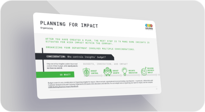 PLANNING FOR IMPACT Organizing AFTER YOU HAVE CREATED A PLAN, THE NEXT STEP IS TO MAKE SURE INSIGHTS IS SITUATED FOR HIGH IMPACT WITHIN THE COMPANY. ORGANIZING YOUR DEPARTMENT INVOLVES MULTIPLE CONSIDERATIONS. CONSIDERATION: Who controls Insights’ budget? Only one-in-four Insights Leaders have total BUDGETS, INNOVATION, AND IMPACT control of their budget, while nearly one-in- ten have no control. BUILDING BUDGET BUDGET INSIGHTS BUSINESS SO WHAT? CONTROL GROWTH INNOVATION IMPACT Budget control is one consideration in Organizing Insights for Impact. Others include: organizational structure/seating; reporting lines – in particular, collaboration with Customer Analytics (CA) and Customer Experience (CX) teams; time allocation; and skill sets. For an in-depth look at organizing your team for Impact, see the complete GRBN Building Business Impact Handbook. 20
