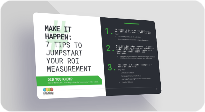It doesn’t have to be perfect, MAKE IT 1.but decide to start, and do it! How? • Use our templates to get the ball rolling. HAPPEN: • Bring a key internal stakeholder along on the journey. Map out decision making in your 7 TIPS TO organization, based on processes 2.used in key business units and decision areas which use JUMPSTART Insights. • Engage key decision-makers to find out how Insights could best YOUR ROI contribute to their meetings, goals, and work. Start there. You need a C-suite champion – 3.make it the CFO. MEASUREMENT Why? They: • Understand numbers DIDYOUKNOW? • Can support measurement efforts • Appreciate forecasting + risk reduction in decisions Next to the CEO, the CFO is likely to have the longest tenure in the C-suite. • Have the CEO’s ear 24