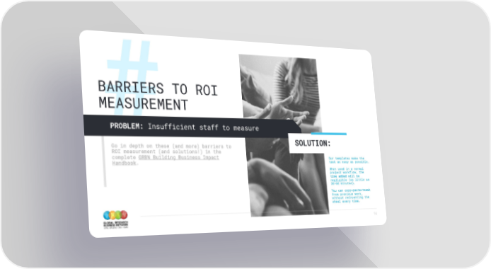 BARRIERS TO ROI MEASUREMENT PROBLEM: Insufficient staff to measure Go in depth on these (and more) barriers to SOLUTION: ROI measurement (and solutions!) in the complete GRBN Building Business Impact Our templates make the Handbook. task as easy as possible. When used in a normal project workflow, the time added will be negligible (as little as 30-60 minutes). You can copy+paste+tweak from previous work, without reinventing the wheel every time. 14
