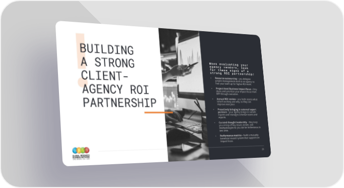 BUILDING When evaluating your A STRONG agency vendors, look for these signs of a strong ROI partnership: • Resource outsourcing –you delegate CLIENT- project management work to an agency to free your team up for higher-ROI work. • Project-level Business Impact focus – they share and prioritize your Impact focus from AGENCY ROI RFP through execution. • Annual ROI review –you both assess what is/isn’t working and why, so they can PARTNERSHIP improve next year. • Proactively bringing in external expert partners – your agency brings in outside experts and manages cohesive teams and reports. • Curated thought leadership – they keep you on top of key issues, trends, and methodologies so you can be in-the-know in less time. • Performance metrics –build a mutually- beneficial reward system that supports an Impact focus. 28