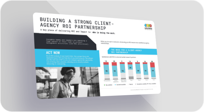 BUILDING A STRONG CLIENT- AGENCY ROI PARTNERSHIP A key piece of delivering ROI and Impact is: who is doing the work. Insights teams and leaders are spending a When you do opt to outsource, measuring your ROI means more satisfactory agency huge amount of their time on project relationships. management activities (low-ROI activities). THE NEED FOR A CLIENT-AGENCY ACT NOW ROI PARTNERSHIP Do an ROI analysis of your team’s time. Use a proper hour-rate Satisfaction with ROI in external market research partners equivalent (your CFO can help here if you don’t know it). This will give you the real cost of DIY so you can compare against the opportunity cost of doing other activities, allowing you to smartly evaluate insourcing vs. outsourcing. Source: BCG/GRBN ROI of Insights survey, May 2017 (n=187)