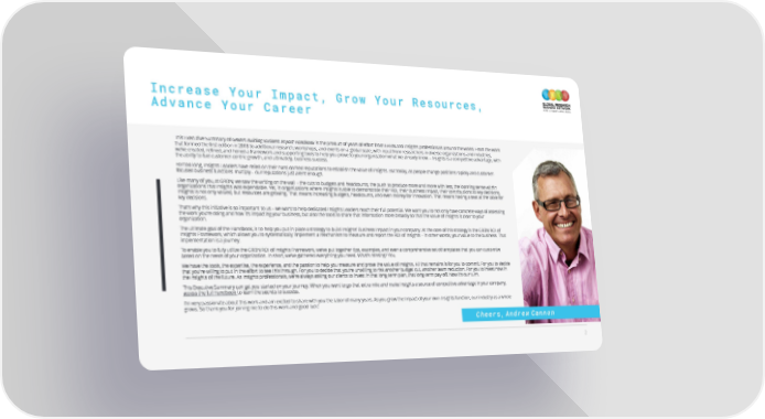 Increase Your Impact, Grow Your Resources, Advance Your Career This Executive Summary of GRBN’s Building Business Impact Handbook is the product of years of effort from GRBN and Insights professionals around the world. From the work that formed the first edition in 2018 to additional research, workshops, and events on a global scale, with input from researchers in diverse organizations and industries, we’ve created, refined, and honed a framework and supporting tools to help you prove to your organization what we already know –Insights is a competitive advantage, with the ability to fuel customer-centric growth, and ultimately, business success. For too long, Insights Leaders have relied on their hard-earned reputations to establish the value of Insights. But today, as people change positions rapidly and customer- focused business functions multiply –our reputations just aren’t enough. Like many of you, at GRBN, we saw the writing on the wall –the cuts to budgets and headcounts, the push to produce more and more with less, the looming sense within organizations that Insights was expendable. Yet, in organizations where Insights is able to demonstrate their ROI, their Business Impact, their contributions to key decisions, Insights is not only valued, but resources are growing. That means increasing budgets, headcounts, and even money for innovation. That means having a seat at the table for key decisions. That’s why this initiative is so important to us –we want to help dedicated Insights Leaders reach their full potential. We want you to not only have concrete ways of assessing the work you’re doing and how it’s impacting your business, but also the tools to share that information more broadly so that the value of Insights is clear to your organization. The ultimate goal of the Handbook, is to help you put in place a strategy to build Insights’ Business Impact in your company. At the core of this strategy is the GRBN ROI of Insights Framework, which allows you to systematically implement a mechanism to measure and report the ROI of Insights –in other words, your value to the business. That implementation is a journey. To enable you to fully utilize the GRBN ROI of Insights Framework, we’ve put together tips, examples, and even a comprehensive set of templates that you can customize based on the needs of your organization. In short, we’ve gathered everything you need. What’s missing? You. We have the tools, the expertise, the experience, and the passion to help you measure and prove the value of Insights. All that remains is for you to commit. For you to decide that you’re willing to put in the effort to see this through. For you to decide that you’re unwilling to risk another budget cut, another team reduction. For you to invest now in the Insights of the future. As Insights professionals, we’re always asking our clients to invest in that long-term plan, that long-term pay-off. Now it’s our turn. This Executive Summary can get you started on your journey. When you want to go that extra mile and make Insights a source of competitive advantage in your company, access the full Handbook to learn the secrets to success. I’m very passionate about this work and am excited to share with you the labor of many years. As you grow the Impact of your own Insights function, our industry as a whole grows. So thank you for joining me to do this work and good luck! Cheers,AndrewCannon 2