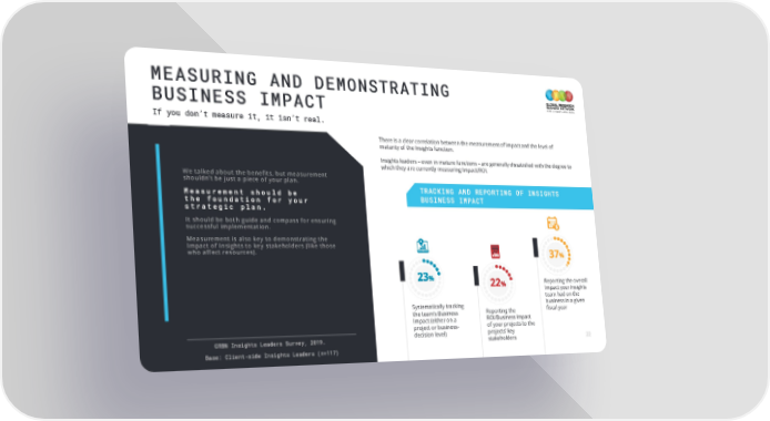MEASURING AND DEMONSTRATING BUSINESS IMPACT If you don’t measure it, it isn’t real. There is a clear correlation between the measurement of Impact and the level of maturity of the Insights function. Insights leaders – even in mature functions – are generally dissatisfied with the degree to which they are currently measuring Impact/ROI. We talked about the benefits, but measurement shouldn’t be just a piece of your plan. TRACKING AND REPORTING OF INSIGHTS Measurement should be BUSINESS IMPACT the foundation for your strategic plan. It should be both guide and compass for ensuring successful implementation. Measurement is also key to demonstrating the Impact of Insights to key stakeholders (like those who affect resources). Reporting the overall Impact your Insights team had on the Systematically tracking business in a given Reporting the fiscal year the team’s Business ROI/Business Impact Impact (either on a of your projects to the project or business- GRBN Insights Leaders Survey, 2019. decision level) projects’ key stakeholders 22 Base: Client-side Insights Leaders (n=117)