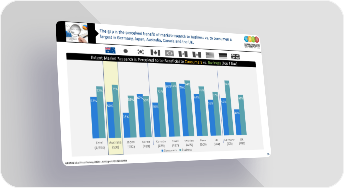 The gap in the perceived benefit of market research to business vs. to consumers is largest in Germany, Japan, Australia, Canada and the UK. Extent Market Research is Perceived to be Beneficial to Consumers vs. Business (Top 2 Box) 80%81% 84% 86% 75% 79% 76% 72% 73% 62% 64% 67% 63% 57% 59% 59% 55% 57% 50% 50% 35% 40% Total Australia Japan Korea Canada Brazil Mexico Peru US Germany UK (4,964) (500) (502) (499) (479) (497) (495) (500) (504) (505) (483) Consumers Business GRBN Global Trust Survey 2020 - AU Report © 2020 GRBN 38