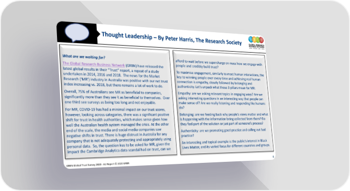 Thought Leadership – By Peter Harris, The Research Society What are we waiting for? afford to wait before we supercharge on mass how we engage with The Global Research Business Network (GRBN) have released the people and credibly build trust? latest global results in their “Trust” report, a repeat of a study To maximise engagement, similarly to most human interactions, the undertaken in 2014, 2016 and 2018. The news for the Market key to winning people over every time and achieving real human Research (‘MR’) industry in Australia was positive with our net trust connection is empathy, closely followed by belonging and index increasing vs. 2018, but there remains a lot of work to do. authenticity. Let’s unpack what these 3 pillars mean for MR: Overall, 75% of Australians see MR as beneficial to companies, Empathy: are we asking relevant topics in engaging ways? Are we significantly more than they see it as beneficial to themselves. Over asking interesting questions in an interesting way that people can one third see surveys as being too long and not enjoyable. make sense of? Are we really listening and responding like humans For MR, COVID-19 has had a minimal impact on our trust scores, do? however, looking across categories, there was a significant positive Belonging: are we feeding back why people’s views matter and what shift for trust in health authorities, which makes sense given how is happening with the information being collected from them? Do well the Australian health system managed the crisis. At the other they feel part of the solution or just part of someone’s process? end of the scale, the media and social media companies saw Authenticity: are we promoting good practice and calling out bad negative shifts in trust. There is huge distrust in Australia for any practice? company that is not adequately protecting and appropriately using An interesting and topical example is the public’s interest in Black personal data. So, the question has to be asked for MR, given the Lives Matter, and its varied focus for different countries and groups. impact the Cambridge Analytica data scandal had on trust, can we GRBN Global Trust Survey 2020 - AU Report © 2020 GRBN 6