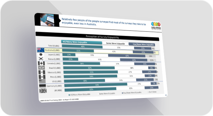 Relatively few people of the people surveyed find most of the surveys they take to be enjoyable, even less in Australia. Perception of Survey Enjoyability All/Many Were Enjoyable Some Were Enjoyable Few/None Were Enjoyable Total (9,406) 40% 35% 21% 4% Australia (1,000) 31% 42% 24% 2% Japan (1,000) 12% 33% 42% 13% Korea (1,000) 15% 44% 31% 11% Canada (1,000) 36% 37% 24% 2% Brazil (1,000) 52% 38% 8% 2% Mexico (1,000) 55% 27% 17% 1% Peru (1,000) 54% 31% 12% 3% US (1,000) 40% 34% 21% 5% Germany (1,000) 64% 27% 7% 2% UK (406) 52% 32% 16% All/Many Were Enjoyable Some Were Enjoyable Few/None Were Enjoyable Don’t know GRBN Global Trust Survey 2020 - AU Report © 2020 GRBN 43