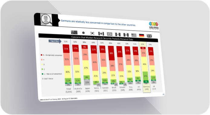 Germans are relatively less concerned in comparison to the other countries. Concern that Market Research Securely Protects Personal Data Top 2 Box 51% 50% 38% 64% 54% 65% 66% 50% 51% 27% 50% 17% 9% 6% 21% 21% 19% 29% 22% 23% 23% 38% 21% 5 – Completely concerned 29% 4 31% 32% 36% 28% 28% 27% 44% 37% 40% 3 28% 2 37% 30% 32% 29% 33% 30% 29% 1 – Not at all concerned 21% Don’t Know 9% 25% 25% 24% 11% 11% 1% 10% 9% 9% 11% 3% 2% 15% 8% 2% 9% 6% 2% 4% 7% 3% 5% 5% 2% 4% 3% 2% 3% 1% 6% 7% 3% 8% Total Australia Japan Korea Canada Brazil Mexico Peru US Germany UK (5,036) (500) (498) (501) (521) (503) (505) (500) (496) (495) (517) GRBN Global Trust Survey 2020 - DE Report © 2020 GRBN 63