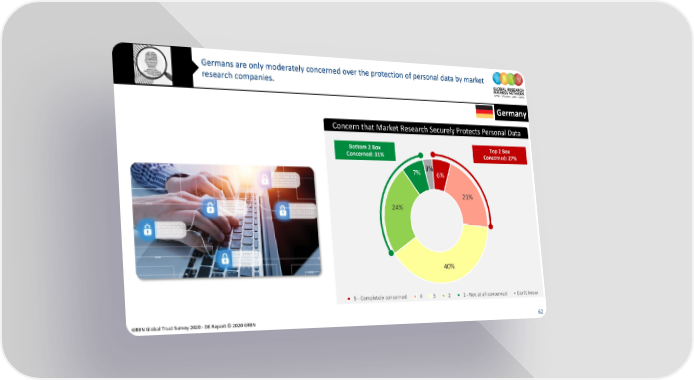 Germans are only moderately concerned over the protection of personal data by market research companies. Germany Concern that Market Research Securely Protects Personal Data Bottom 2 Box Top 2 Box Concerned: 31% Concerned: 27% 7% 3% 6% 21% 24% 40% 5 - Completely concerned 4 3 2 1 - Not at all concerned Don't know GRBN Global Trust Survey 2020 - DE Report © 2020 GRBN 62