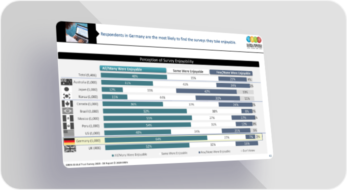 Respondents in Germany are the most likely to find the surveys they take enjoyable. Perception of Survey Enjoyability All/Many Were Enjoyable Some Were Enjoyable Few/None Were Enjoyable Total (9,406) 40% 35% 21% 4% Australia (1,000) 31% 42% 24% 2% Japan (1,000) 12% 33% 42% 13% Korea (1,000) 15% 44% 31% 11% Canada (1,000) 36% 37% 24% 2% Brazil (1,000) 52% 38% 8% 2% Mexico (1,000) 55% 27% 17% 1% Peru (1,000) 54% 31% 12% 3% US (1,000) 40% 34% 21% 5% Germany (1,000) 64% 27% 7% 2% UK (406) 52% 32% 16% All/Many Were Enjoyable Some Were Enjoyable Few/None Were Enjoyable Don’t know GRBN Global Trust Survey 2020 - DE Report © 2020 GRBN 43
