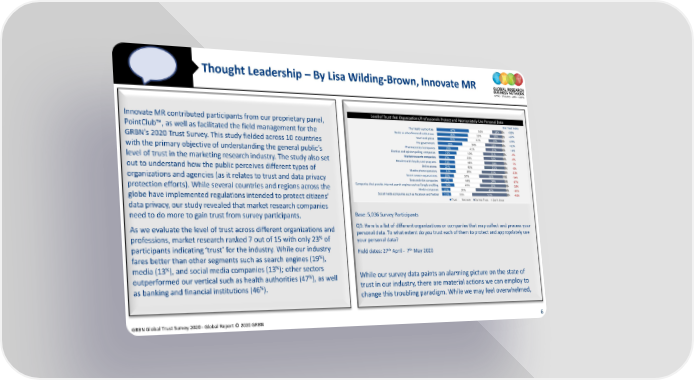 Thought Leadership – By Lisa Wilding-Brown, Innovate MR Innovate MR contributed participants from our proprietary panel, PointClub™, as well as facilitated the field management for the GRBN’s 2020 Trust Survey. This study fielded across 10 countries with the primary objective of understanding the general public’s level of trust in the marketing research industry. The study also set out to understand how the public perceives different types of organizations and agencies (as it relates to trust and data privacy protection efforts). While several countries and regions across the globe have implemented regulations intended to protect citizens’ data privacy, our study revealed that market research companies need to do more to gain trust from survey participants. Base: 5,036 Survey Participants As we evaluate the level of trust across different organizations and Q3: Here is a list of different organizations or companies that may collect and process your % personal data. To what extent do you trust each of them to protect and appropriately use professions, market research ranked 7 out of 15 with only 23 of your personal data? participants indicating ‘trust’ for the industry. While our industry th April - 7th May 2020 % Field dates: 27 fares better than other segments such as search engines (19 ), % % media (13 ), and social media companies (13 ); other sectors % While our survey data paints an alarming picture on the state of outperformed our vertical such as health authorities (47 ), as well % trust in our industry, there are material actions we can employ to as banking and financial institutions (46 ). change this troubling paradigm. While we may feel overwhelmed, GRBN Global Trust Survey 2020 - Global Report © 2020 GRBN 6