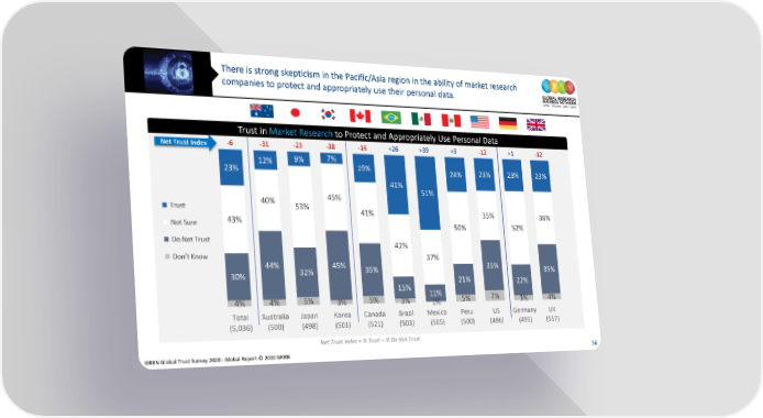 There is strong skepticism in the Pacific/Asia region in the ability of market research companies to protect and appropriately use their personal data. Trust in Market Research to Protect and Appropriately Use Personal Data Net Trust Index -6 -31 -23 -38 -16 +26 +39 +3 -12 +1 -12 12% 9% 7% 19% 23% 24% 23% 23% 23% 41% 51% 40% 45% Trust 53% 41% 35% 38% Not Sure 43% 50% 52% Do Not Trust 42% Don’t Know 37% 44% 32% 45% 35% 35% 35% 30% 21% 22% 15% 11% 4% 4% 5% 3% 5% 3% 1% 5% 7% 3% 4% Total Australia Japan Korea Canada Brazil Mexico Peru US Germany UK (5,036) (500) (498) (501) (521) (503) (505) (500) (496) (495) (517) Net Trust Index = % Trust – % Do Not Trust GRBN Global Trust Survey 2020 - Global Report © 2020 GRBN 56