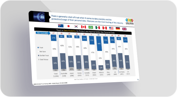 There is generally a lack of trust when it comes to data analytics and the protection/usage of their personal data. Mexicans are the most trusting of this industry. Trust in Data Analytics to Protect and Appropriately Use Personal Data Net Trust Index -17 -35 -24 -31 -23 -1 +30 -4 -18 -36 -25 17% 8% 7% 8% 15% 9% 17% 25% 22% 20% 44% 43% 51% 49% 40% Trust 44% 42% 34% 39% Not Sure 47% 49% Do Not Trust Don’t Know 42% 34% 44% 32% 39% 38% 38% 45% 42% 26% 26% 5% 5% 10% 5% 5% 13% 4% 9% 5% 3% 1% 2% Total Australia Japan Korea Canada Brazil Mexico Peru US Germany UK (5,036) (500) (498) (501) (521) (503) (505) (500) (496) (495) (517) Net Trust Index = % Trust – % Do Not Trust GRBN Global Trust Survey 2020 - Global Report © 2020 GRBN 58