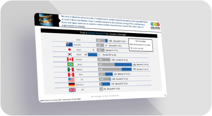 Not only in absolute terms, but also in relative terms, market research companies rank especially highly on trust in Brazil and Mexico. Trust in market research is also relatively strong in Peru and Germany. Korea and Japan stand out as countries where market research is less trusted than other types of organizations on average. Trust in Market Research (vs. Country Average) Total +15 +18 (Ranked 8thof 15) Net Trust Index th Market Research Companies Australia +12 +7 (Ranked 8 of 15) Country Average Japan 0 +12 (Ranked 9th of 15) Korea -14 +1 (Ranked 12th of 15) Canada +20 +18 (Ranked 8thof 15) Brazil +27 +56 (Ranked 2ndof 15) Mexico +38 +55 (Ranked 2ndof 15) Peru +11 +22 (Ranked 4thof 15) US th of 15) +18 +18 (Ranked 8 th Germany +3 +17 (Ranked 5 of 15) UK +6 +5 (Ranked 9thof 15) Net Trust Index = % Trust – % Do Not Trust GRBN Global Trust Survey 2020 - Global Report © 2020 GRBN 23