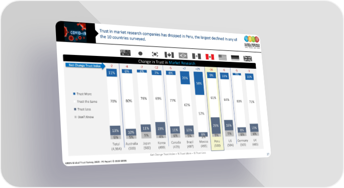 Trust in market research companies has dropped in Peru, the largest declined in any of the 10 countries surveyed. Change in Trust in Market Research Net Change Trust Index -2 -4 -7 -12 -5 +7 +29 -16 -6 -5 -3 11% 6% 4% 7% 6% 9% 10% 3% 10% 20% 36% Trust More 76% 69% 61% Trust the Same 70% 80% 77% 64% 83% 71% 62% Trust Less Don’t Know 57% 13% 11% 19% 11% 25% 16% 13% 10% 13% 8% 6% 5% 9% 4% 6% 5% 6% 5% 9% 6% 6% 1% Total Australia Japan Korea Canada Brazil Mexico Peru US Germany UK (4,964) (500) (502) (499) (479) (497) (495) (500) (504) (505) (483) Net Change Trust Index = % Trust More – % Trust Less GRBN Global Trust Survey 2020 - PE Report © 2020 GRBN 27